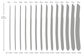 - Forskellige størrelser og vægte: Ø 4 mm-17 mm, total længde 18,7 cm-19,1 cm, indsættelse længde 13,4 cm-13,7 cm, vægt 16 g-78 g.