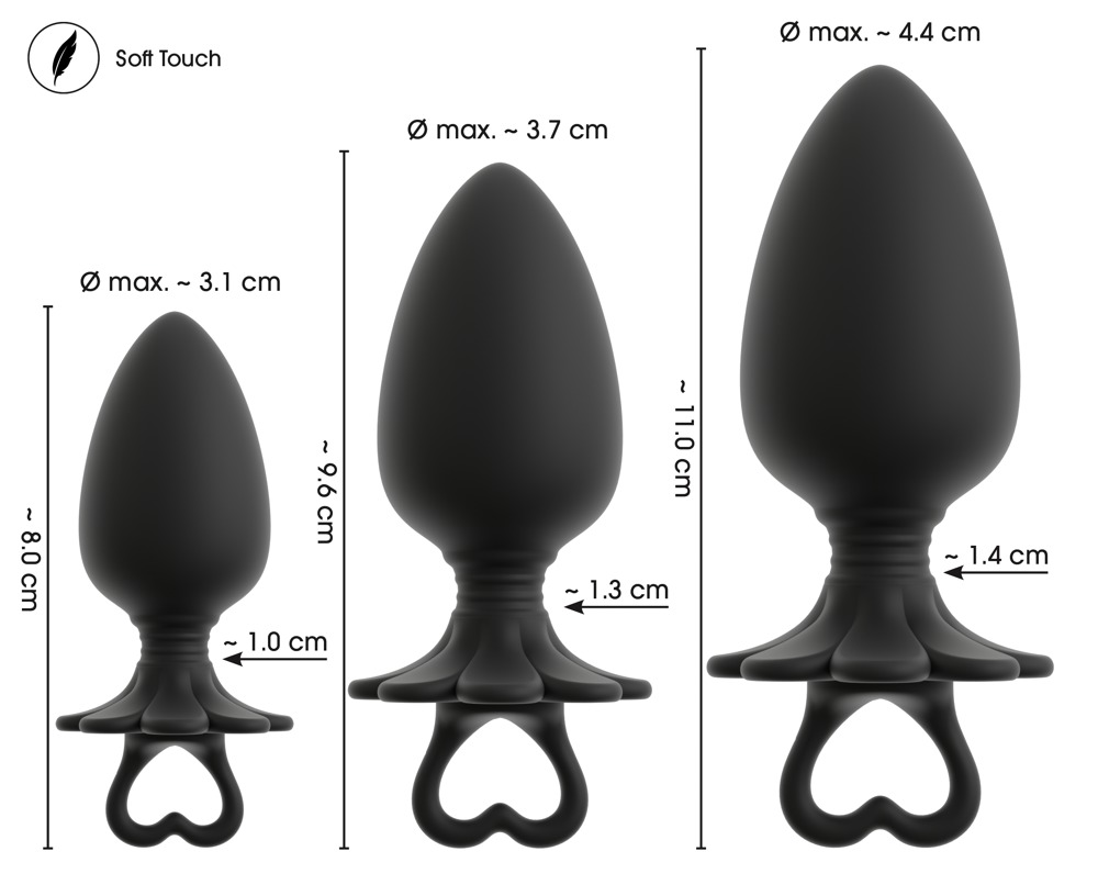 Blomstercharme til din bagdørsfornøjelse! Analplug-sættet forfører dig med sensuelt silkeagtigt silikone og en form, der passer perfekt til dig. Fra blid indføring til intens træning – vælg den størrelse, der passer til dig! De buleformede silikonepropper glider blødt ind og giver en intens følelse af fylde. Det hjerteformede håndtag gør legen særlig behagelig, mens den legesyge blomsterstopper sikrer, at pluggen sidder sikkert og ser flot ud. Blød, fleksibel og ultrakomfortabel – perfekt til dit næste lystniveau. Hvad venter du på?