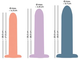 Three in a Row – hele 3 massive silikone-dildoer i bløde pastelfarver venter på dig! Alle er forskellige i størrelse og vægt, men altid behageligt faste og dejligt fleksible. Perfekt til at opdage nye lysthorisonter alene eller sammen! Takket være deres generøse størrelse er disse dildoer som skabt til erfarne brugere, der har lyst til mere variation, udfordring og målrettet udvidelse – vaginalt eller analt. Hver dildo glider særligt smidigt med sin silkeagtige, glatte overflade og tilpasser sig optimalt til din krop og dine bevægelser takket være sin fleksibilitet. Den ekstra store sugebase garanterer sikkert hold på alle glatte overflader, forhindrer, at den glider ind, og gør sættet også sikkert til anal brug. Uanset om det er til håndfri ridning eller i en strap-on – du har alle muligheder for at prøve dig frem og øge intensiteten. Tag det næste skridt – du vil mærke forskellen!