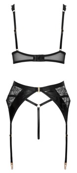 - Snit & materiale: 3-delt sort sæt med bøjle-bh, hofteholder og g-streng. Materialeblanding af blonder og lak, guldfarvede accessories. Bøjle-bh med let polstrede lak-cups, elastiske cup-stropper, der kan justeres. Justerbar hægtelukning bagpå. Stropper dekoreret med blonder. Hofteholder med ring foran og hægtelukning bagpå i elastisk linning, justerbare strømpebånd. G-streng med ring og udskæring i blonder foran. 96% polyester, 4% elastan, polyuretanbelægning; blonder 84% polyamid, 16% elastan.