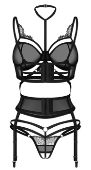 • Snit og materiale: BH med bøjler, hofteholder og bundløs g-streng i sæt. Sort-gennemsigtig med blondedetaljer og elastiske stropper. BH med bøjler og cupstropper. Justerbar hægtelukning i ryggen, justerbare stropper. Fra hofteholderen forenes 2 justerbare stropper til en brystrem, der fører til det justerbare choker-halsbånd (med hægtelukning). Hofteholder med hægtelukning bagpå, justerbare strømpeholdere. String med åben skridt. 94% polyamid, 6% elastan; 100% polyester; 100% polyamid.