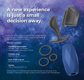 Er du klar til at overraske dig selv? Det eksklusive Men Love Toy Starter Set giver dig 4 højkvalitets legetøj til mænd i en stilfuld pakke – perfekt til at have det rigtig sjovt alene eller sammen med en partner. Vibro-masturbator, analplug, penisring-trio og stroker-masturbator venter bare på at blive afprøvet af dig. Alle legetøjer er super nemme at bruge og ideelle for begyndere – så bliver starten i verden af intime legetøj en sand fornøjelse!