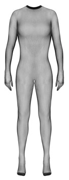 - Snit og materiale: Sort catsuit ouvert af fint netmasker. Med integrerede handsker og fødder, forstærket tåparti. Stor udskæring i ryggen. Åben i skridtet. 94 % polyamid, 6 % elastan.