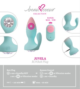 - Leveringsomfang: 1 x JUVELA RC Butt Plug fra beau cœur. Inkluderet USB-opladerkabel og batteri til fjernbetjeningen (CR2032).