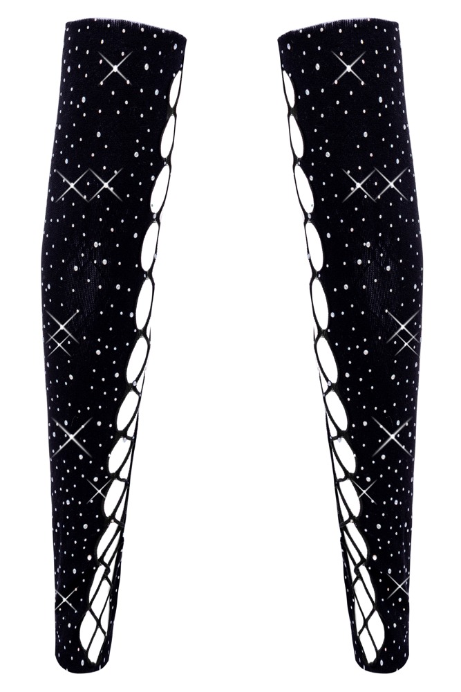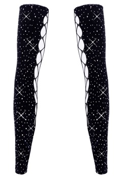 - Snit & materiale: Sorte, rundstrikkede armvarmere i snøreoptik. Pyntet med glitrende sten i forskellige størrelser. 94 % polyamid, 6 % elastan.