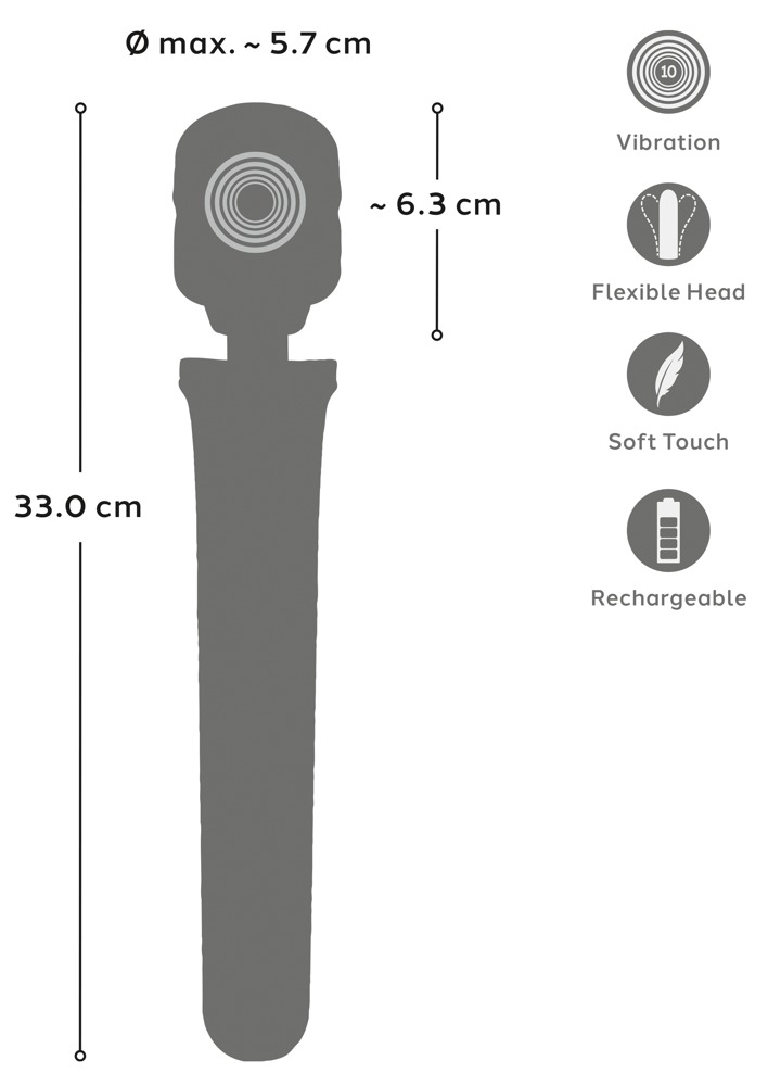 Samlet længde 33 cm, massagehoved 6,3 cm langt, Ø 5,7 cm.