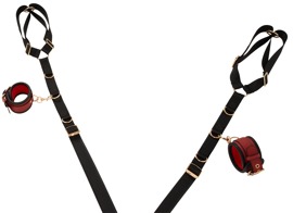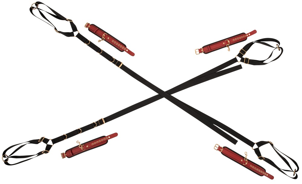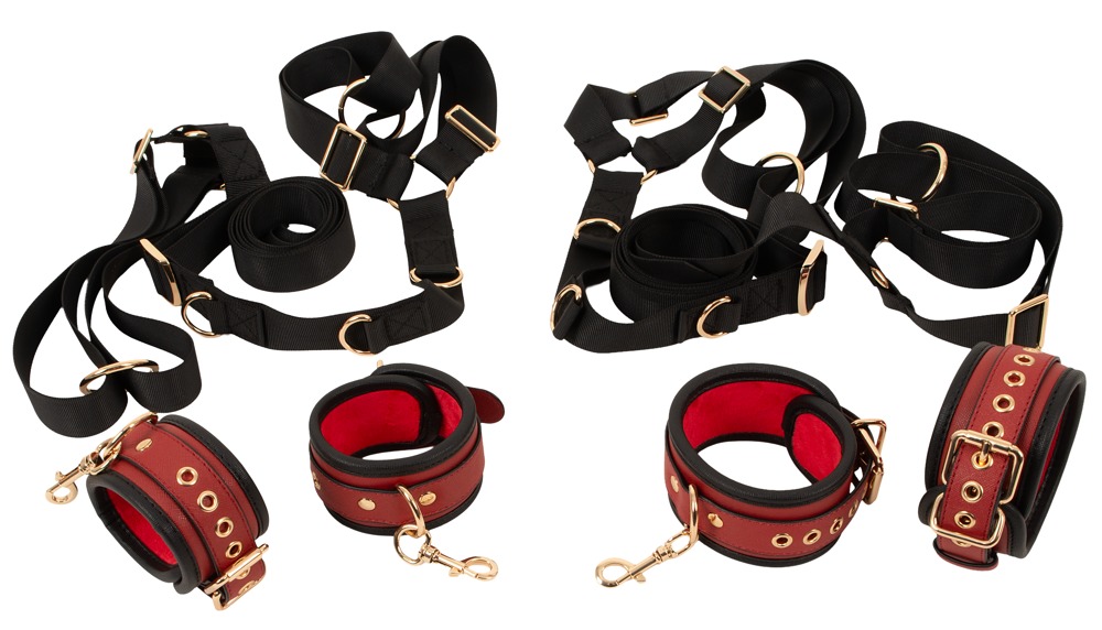 Gør dit soveværelse til en eksklusiv scene for sensuelle eventyr – eller forvandl enhver dør til et forførende andreaskors på et øjeblik! Med dette luksuriøse komplette sæt kan du på et øjeblik skifte fra hverdagen til en spændende bondage-session. Gyldne accenter og det fineste imiterede læder giver dit spil et strejf af glamour og lader elegance og lidenskab smelte sammen på en fascinerende måde. Du skal blot fastgøre det raffinerede bæltekors til sengen eller døren, klikke håndjernene på plads – og så kan det pirrende fornøjelse begynde. De bløde manchetter tilbyder en behagelig 4-punkts fastgørelse og sidder behageligt og sikkert, selv under vilde eskapader. Mærk den spændende gnist, når du overgiver dig helt til din elskede med spredte arme og ben – og nyd følelsen af at løfte lyst og hengivenhed til et nyt niveau!