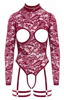 - Snit og materiale: Burgunderrød langærmet body med stropper. Blomsterblonder med fløjlsdetaljer og roséguldfarvede smykkekæder. Ouvert-stil med Cut-outs til brysterne og åben skridt. Smuk rund udskæring i ryggen. Hjerteformet smykkekæde foran på den stående krave (med hægte) kan tages af, karabinhage ved ringene under brysterne kan tages af. Justerbare stropper og lårbånd kan tages af. 90% polyamid, 10% elastan.
