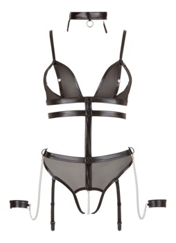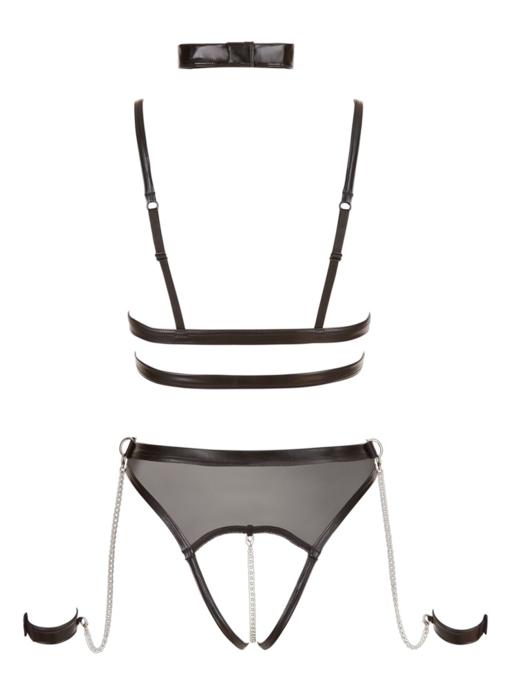 Ouvert stroppetrøje fra Cottelli BONDAGE i harness look lavet af fint powernet med spændende wetlook detaljer. Kopper med slids og trykknapper, som kan åbnes. Det helt åbne skridt har en aftagelig, stimulerende skridtkæde. De medfølgende bløde ankel-sleeves til hænderne med karabinhager (hver 28 cm lange) kan nemt fastgøres til linningens sideringe. Ankelstropper med justerbare velcrolukninger. Stropper og 2 strømpeholdere, der kan justeres foran - strømpeholderne er også aftagelige. Inkluderer wetlook halsbånd med ring foran og velcrolukning bagpå.