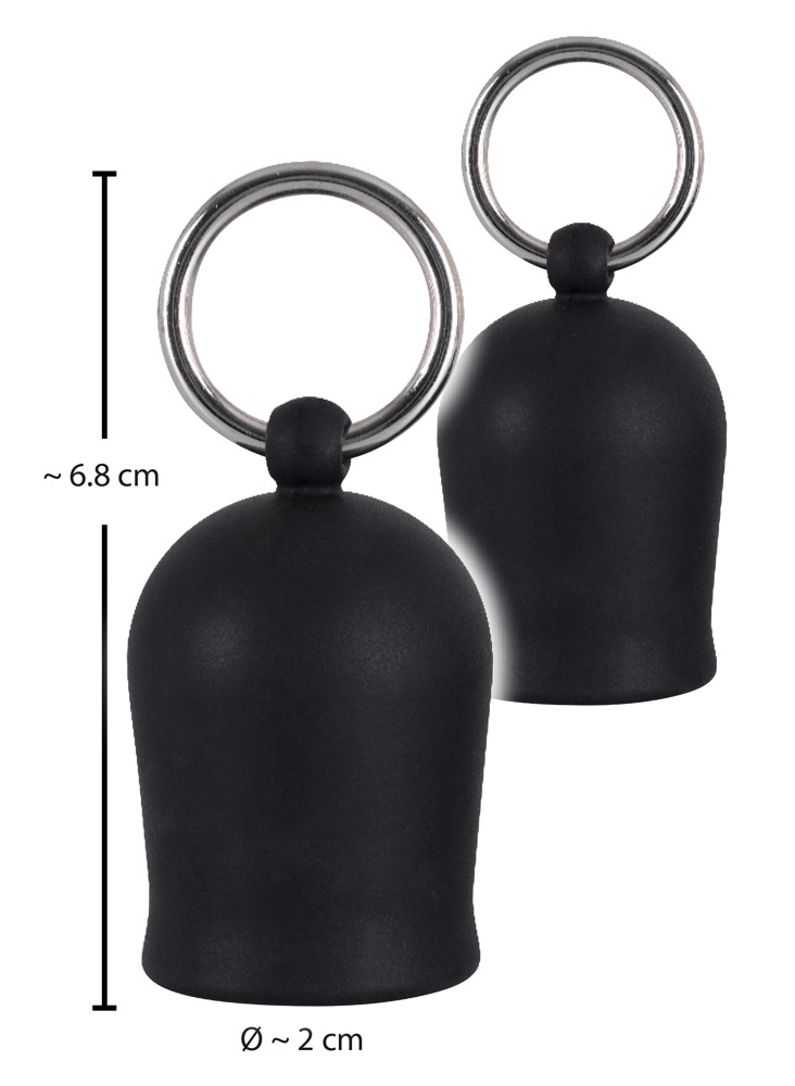 To sorte brystvortesugere med metalring. Sugerne sættes på brystvorterne, og ved at klemme dem sammen opstår det sugende vakuum. Indv.-Ø 2,1 cm. Materiale: Silikone, metal.