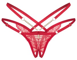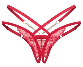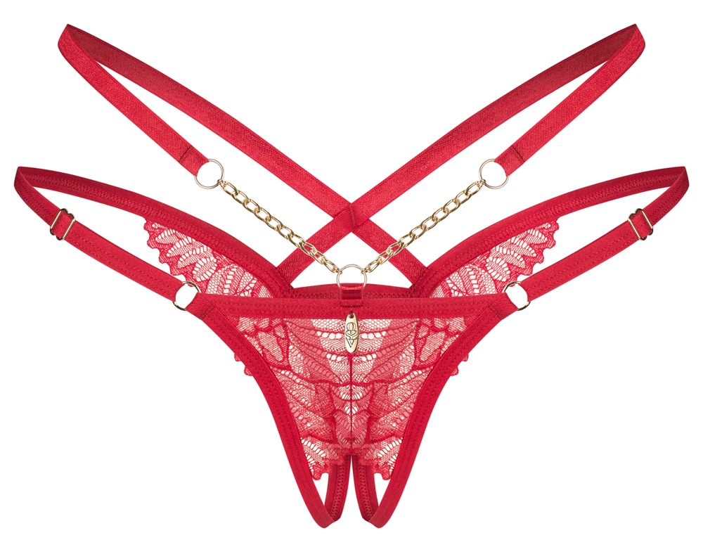 - Snit og materiale: Bundløs riostreng i remstil. I dyb rød med blonder og guldfarvede detaljer. 2 kæder og lille dekorativt element foran. Justerbar rem i bunden. Åben i skridtet. 90% polyamid, 10% elastan.