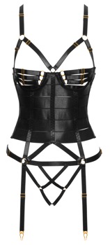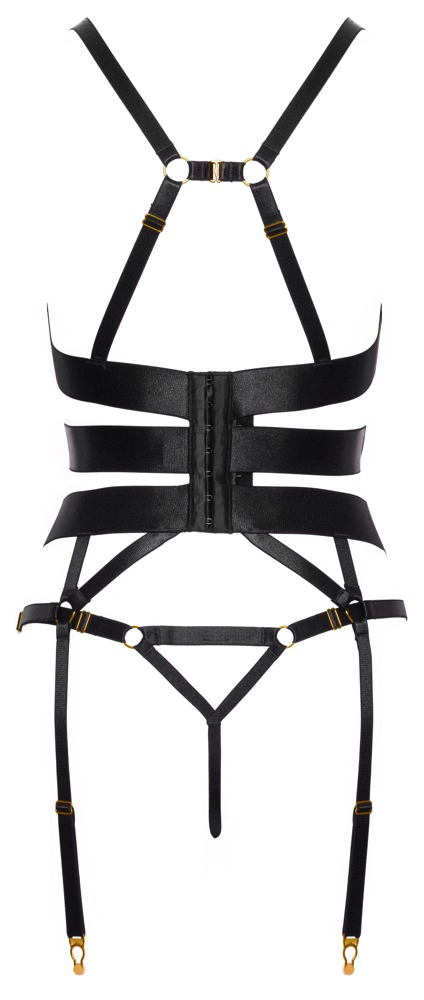 • Snit og materiale: Corsage og skridtløs g-streng i et sæt. Sort, elastiske bånd og stretchstropper i satinlook, guldfarvede accessories. Korset med indarbejdede formstænger, justerbar hægtelukning i ryggen. Også justerbar: stropperne, der er forbundet med en hage bagpå, de mange cup-stropper og strømpebåndene. G-streng med stropper (ikke kun) åben i skridtet. 60% polyester, 40% elastan.