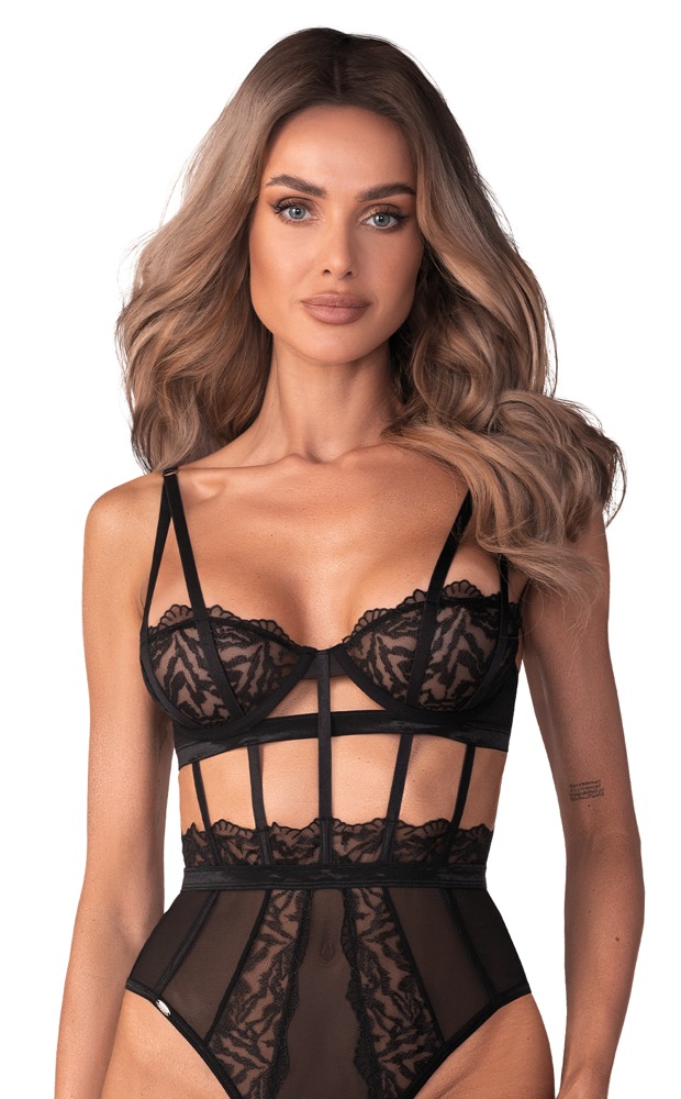Sort skridtløs Hersis body fra Obsessive lavet af delikate blonder med gennemsigtige indsatser. Blød og elastisk med et ekstravagant stroplook. Med skåle med bøjle for en smuk kavalergang. De sofistikerede stropper og bh-hægte på den åbne ryg kan justeres, så de passer. Den spændende numsefri one-piece har også et smykkelås bag på taljen. G-strengene i det helt åbne skridt kan også justeres, så de passer.