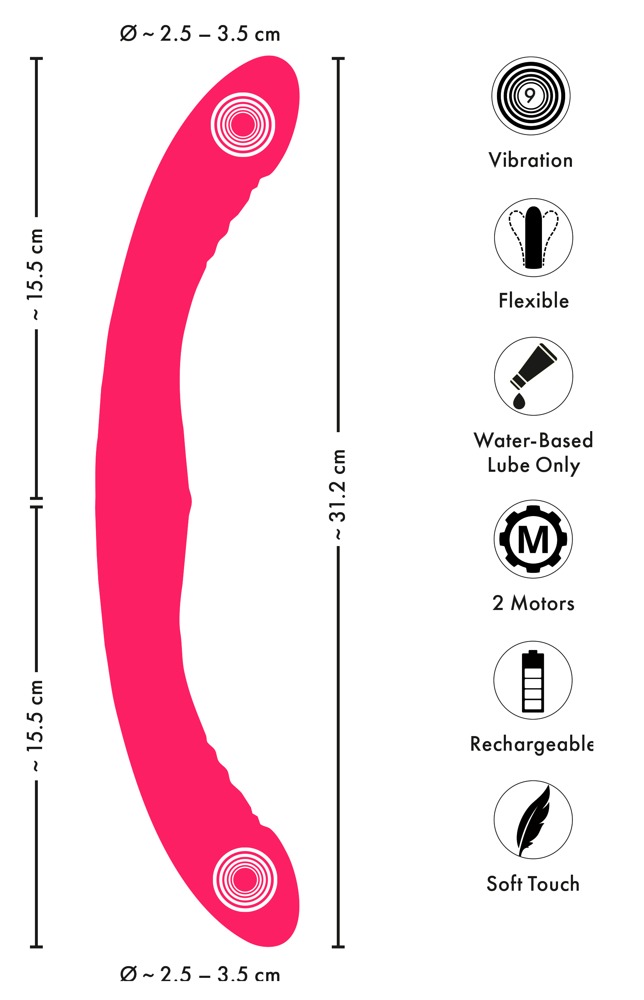 Du kan ikke kun nyde dobbeltvibratoren alene. Du kan også dele den med din partner! Den ekstra lange og perfekt buede dobbeltvibrator giver jer begge to nydelse på samme tid. Med intense strukturer og vibrationer for et fælles fyrværkeri af lyst. Takket være den silkeagtige Soft Touch-overflade er begge ender lette at indføre og glider som af sig selv. Den er behageligt fleksibel og følger alle dine bevægelser. En parvibrator, der forbinder – jeres lystbro til fælles højdepunkter!