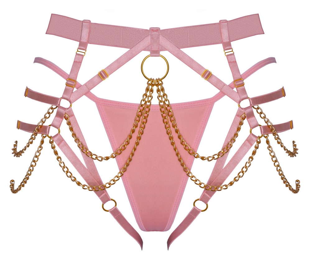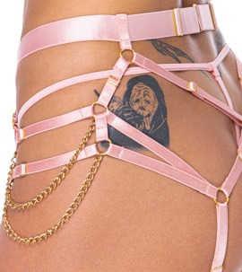 - Snit og materiale: Harness-g-string inklusive mini-g-string. Roséfarvet, guldfarvede accessories. Harness-g-string af elegant skinnende stretchbånd. Kæder foran og i siden. 95% polyester, 5% elastan, metal.