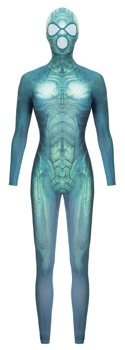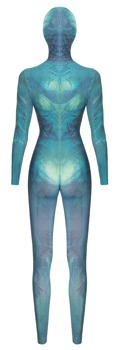 • Snit og materiale: Tætsiddende, taljeret langærmet jumpsuit med påsyet hovedmaske. Grøn-blå fantasy-reptil-look. Fin lynlås bagpå. Hovedmaske med enkelt kantede åbninger til mund og øjne. Uden fødder. 88 % polyester, 12 % elastan.
