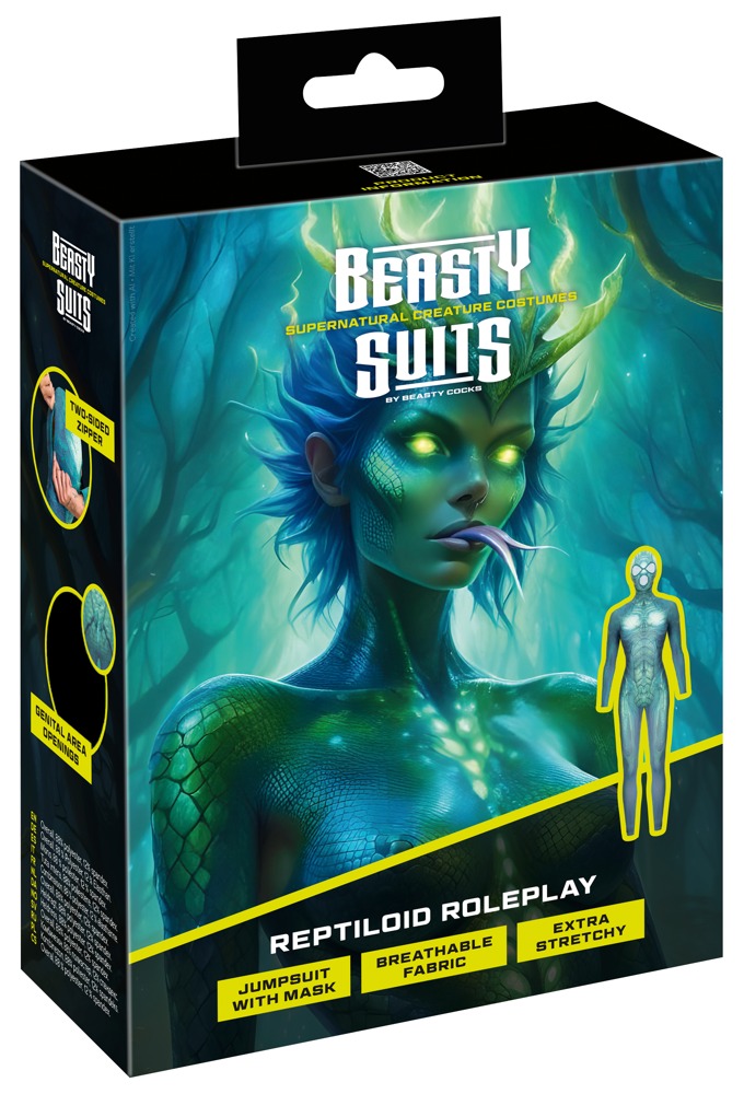 Klar til din næste forvandling? Hop i denne tætsiddende jumpsuit og vend op og ned på verden! Det grøn-blå fantasy-reptil-look gør dig til et ægte blikfang – så smukt, som om det var din anden hud. Ultrablu og megaelastisk, så du kan bevæge dig frit, uanset hvor vildt dit eventyr bliver. Den fine lynlås i ryggen gør det nemmere at tage den af og på – og den åbne skridt giver dig en forførende frihed, der elektrificerer dig hver gang. Den påsyede hovedmaske med åbninger til mund og øjne lader dig fordybe dig dybt i rollen uden at miste overblikket. Det er tid til at vække dyret i dig – tag din Beasty Suit på, og så er du midt i eventyret!