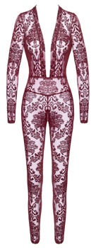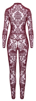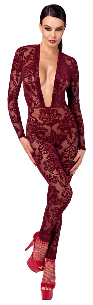 • Snit og materiale: Mørkerød, gennemsigtig, tætsiddende langærmet jumpsuit med fløjlsprint. Ekstra dyb udskæring, lynlås i skridtet. 86 % polyamid, 14 % elastan.