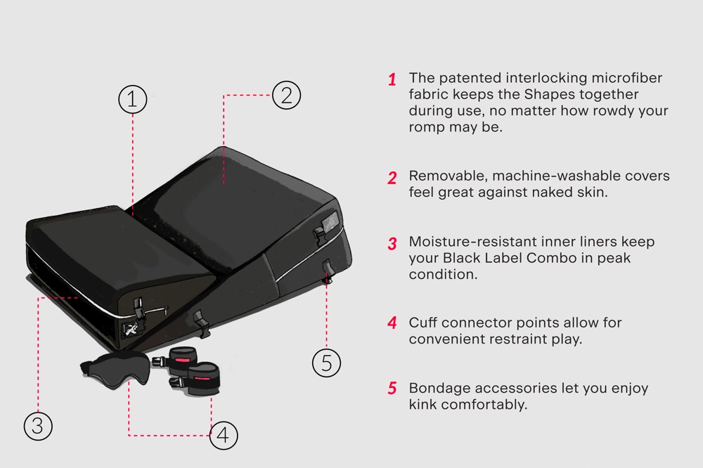 Med de to kærlighedspuder, håndjern og øjenmaske kan I opdage mange nye stillinger og genopdage nogle gamle. De bløde mikrofiberbetræk på de to kærlighedspuder klæber sammen, så I kan kombinere de to kiler uden at de glider. Med de aftagelige hånd- og fodjern har I også mulighed for at udleve jeres bondage-lyster.