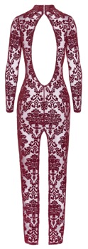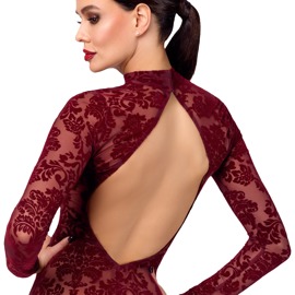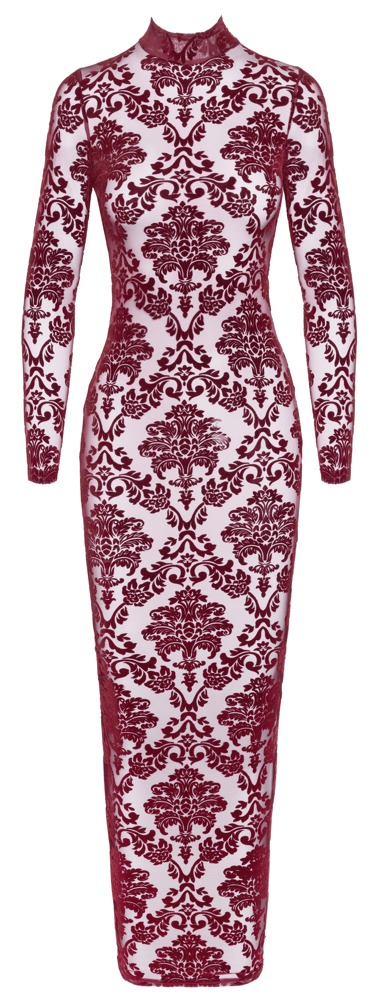 - Snit og materiale: Mørkerød, gennemsigtig langærmet kjole med fløjlsprint. Ankellang, tætsiddende og taljeret. Stor udskæring i ryggen, stående krave med hægte, ekstra høj slids bagpå. 86 % polyamid, 14 % elastan.