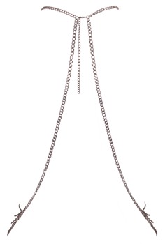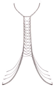 - Kropssmykke: Frodig kædebesætning mellem brysterne og over hofterne, justerbare karabinhager i nakken (halskæde).