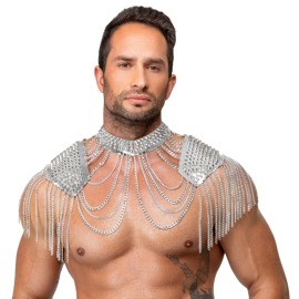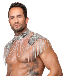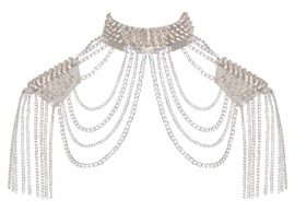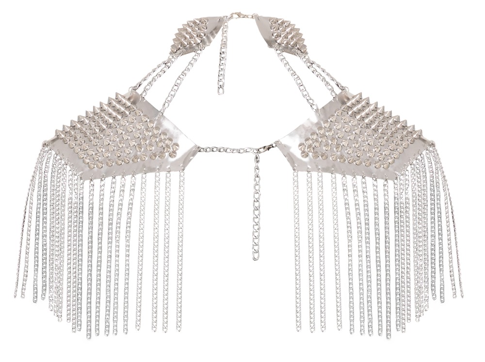 Gør dig klar til din store entré: Denne iøjnefaldende kropssmykke får dig til at funkle som en diskokugle! Forskellige kæder, skinnende smykkeelementer og seje pigge smelter sammen til et statement-stykke, der er mere end bare smykker – det er ren attitude! Smykket lægger sig som en glamourøs bolero eller en skinnende rustning omkring hals, skuldre og overarme og får både din forside og bagside til at stråle. Unisex og takket være karabinhager kan den tilpasses individuelt til alle. Uanset om den bæres nøgen på huden som et erotisk highlight eller kombineres stilfuldt med stramme outfits: Med dette ekstravagante kædesmykke er du altid iøjnefaldende. Forkæl dig selv med mere drama, mere glamour, mere wow!