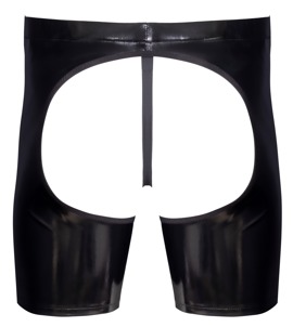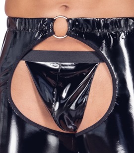 Provokerende blikfang – ikke for genert fyre! Disse lak-chaps får dig ikke kun til at skinne – de gør dig til den vildeste fristelse på to ben! Det dybsorte, let elastiske lakmateriale sidder behageligt, mens den åbne skridt og den frie bagdel sender et klart budskab. Den elastiske linning sikrer komfort, og den skinnende ring foran sætter et frækt statement. Og lak-strengen? Den følger med – hvis du overhovedet har brug for den ...