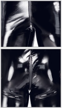 - Snit og materiale: Sort, skinnende lak-playsuit med korte ærmer og ben. Foret 3-vejs lynlås fra den stående krave gennem skridtet og ned over bagdelen. 100% polyester med polyuretanbelægning.