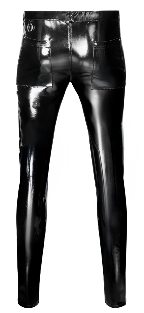 • Snit og materiale: Tætsiddende, sorte lakbukser med sølvfarvede metal detaljer (nitter, ringe, lynlåse). Lommer foran, påsatte lommer bagpå. Lynlås med underlæg foran, stretch linning med bæltestropper. Lynlåslommer på lårene. Knæpartier med indsnit. 100 % polyester, polyuretanbelægning.