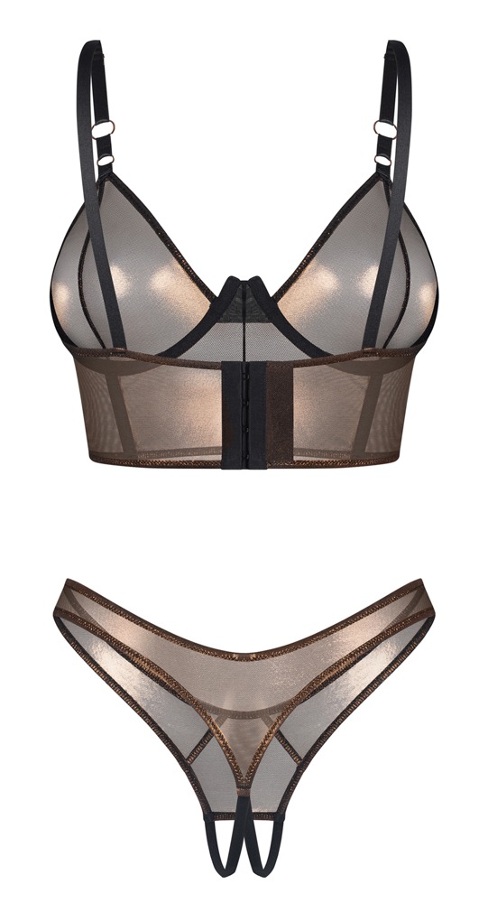 • Snit og materiale: Sæt med bøjle-bh og skridtløs riostring. Bronsefarvet, halvgennemsigtig med elegant glans, sorte detaljer. Lidt længere bøjle-bh, stropper og hægtelukning i ryggen kan justeres. Riostring åben i skridtet. 95 % polyester, 5 % elastan.