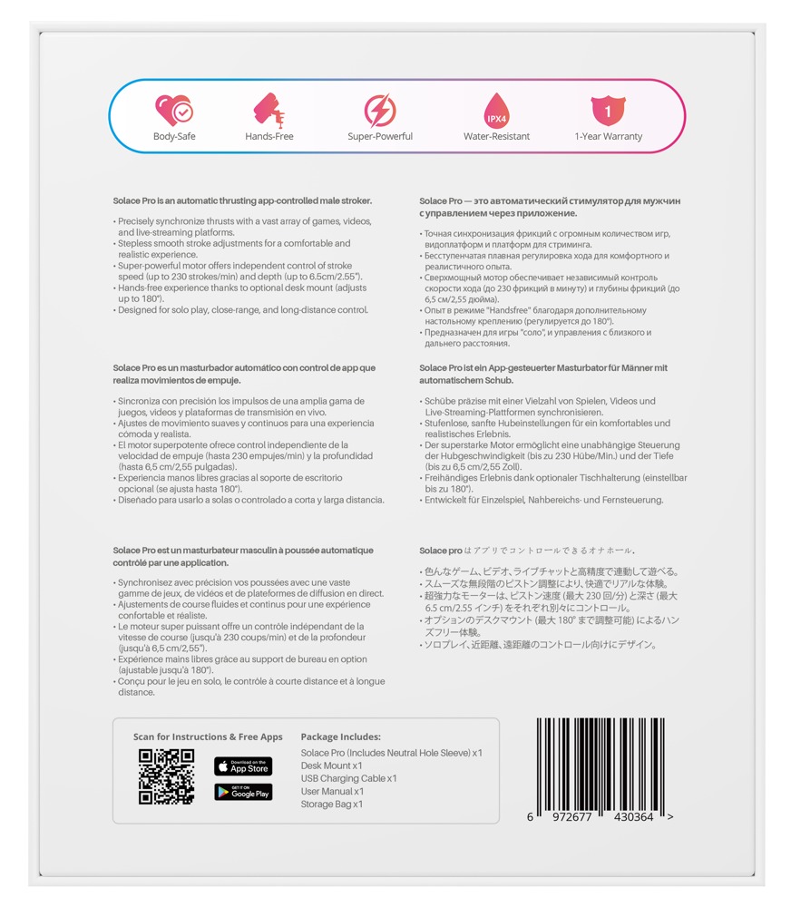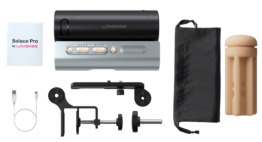 - Leveringsomfang: 1 x App-controlled automatic male stroker Solace Pro fra Lovense inklusive USB-opladerkabel og bordholder.