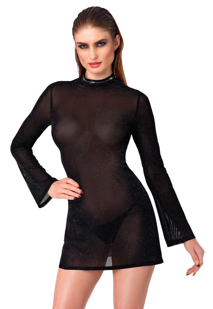 • Snit og materiale: Minikjole i sort, fin glittertransparens. Udvidet nederdel, lange trompetærmer. Stående krave dekoreret med glitterbånd hele vejen rundt. 75 % polyamid, 20 % polyester, 5 % elastan.