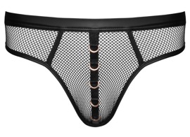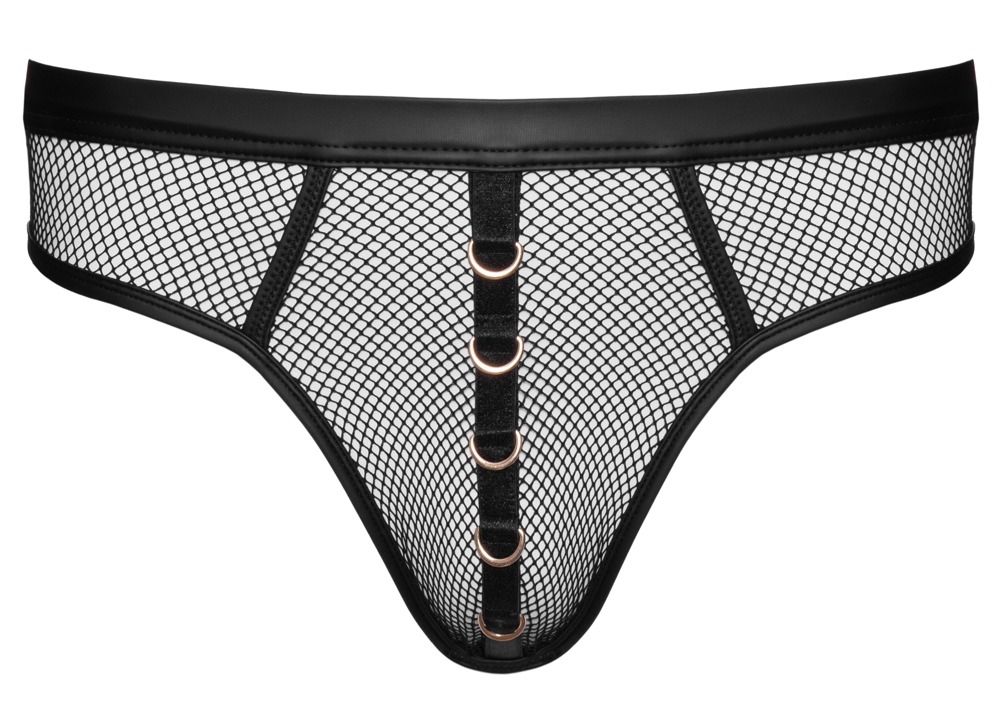 • Snit og materiale: Betonende sort g-string i net, stilfulde detaljer i wetlook. 5 guldfarvede ringe på posen. Net 90 % polyester, 10 % elastan; wetlook 90 % polyester, 10 % elastan, polyuretanbelægning.