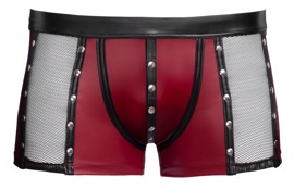 - Snit og materiale: Tætsiddende underbukser i rød mat look med sorte detaljer og netindsatser i siderne. Sølvfarvede nitter og trykknaplukning i skridtet. 85% polyester, 15% elastan; net 90% polyamid, 10% elastan.