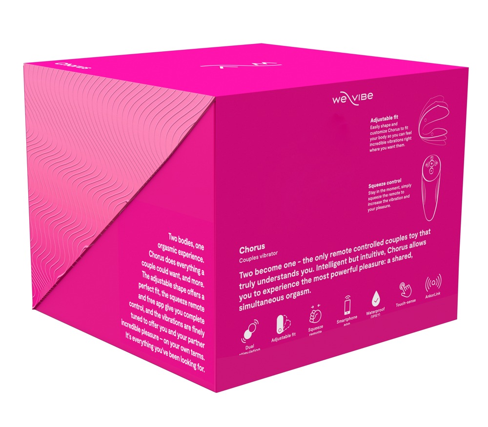 Den intuitive parvibrator med tilpasselig form, berøringsfølsomme sensorer og håndfri vibrationer tager sex til et helt nyt niveau. Chorus stimulerer samtidig din G-punkt og din klitoris med vibrationer. Derudover får din partner under sex den unikke fornøjelse af forførende tæthed med sensuelle vibrationer. Den innovative silky touch overflade af silikone er blød som silke, og den fleksible Chorus tilpasser sig perfekt til din krop takket være sin bevægelighed, så parvibratoren forbliver, hvor den skal, selv uden at blive holdt fast. Betjeningen foregår nemt via fjernbetjeningen, via appen eller ved direkte kontakt. Du kan også nyde al den sjov i brusebadet eller badekarret, da Chorus er vandtæt. Den smukke opbevaringsboks, hvor du kan oplade legetøjet og fjernbetjeningen, er også særlig praktisk. Vidunderligt diskret derhjemme og på farten.