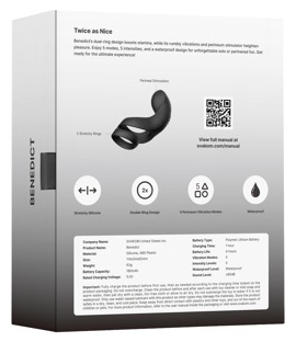 En kraftig, støjsvag motor giver 5 forskellige vibrationsmodi i 5 intensiteter, som kan styres separat og i kombination ved at trykke på knappen direkte på legetøjet. Kan også bruges under vand, da Benedict er vandtæt! Den fløjlsbløde, kropsvenlige silikone gør den nem at tage på og smigrer sig tæt til huden om enhver penisstørrelse og -form.