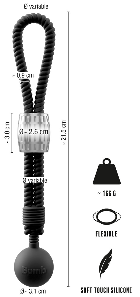 Du kan bruge silikoneløkken som penisring og/eller testikelring. Med skydevikten kan du variere diameteren. Bær den elastiske løkke KUN omkring din penis eller KUN omkring dine testikler. Det er særligt smart at placere skydevikten midt på løkken, så der dannes to løkker. Den ene løkke trækkes over penis, og den anden løkke trækkes over testiklerne. Dobbelt støtte og dobbelt så meget sjov. Prøv det!