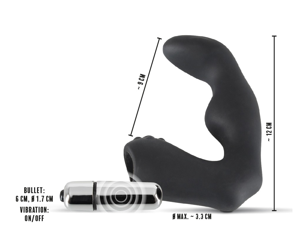 L-formet vibrator med dupper ved basis og fortykket skaft. Vibro-ægget kan tages ud. Sort/sølvfarvet.