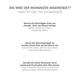 Womanizer Pro er meget nem at bruge: Spred først dine vulvalæber let, så klitoris er fri. Sæt derefter stimuleringshovedet på din kærlighedsperle. Med et tryk på en knap starter og styrer du luftvibrationerne i 11 intensiteter – så kan fornøjelsen begynde! Lidt vandbaseret glidecreme sørger for ekstra smidighed. Prøv det!