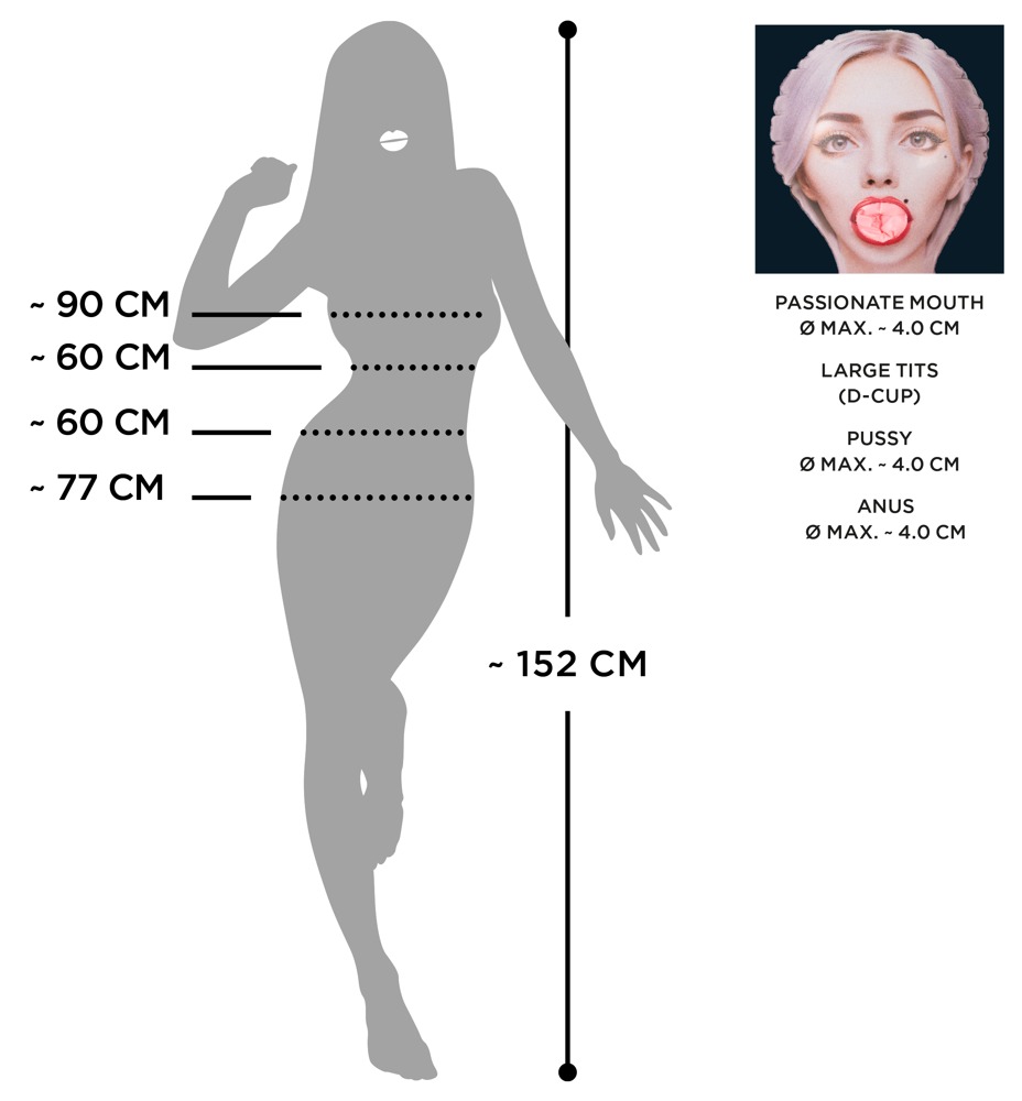 På et øjeblik er den petite tatoverede prinsesse oppustet og viser sig i al sin pragt – inklusive XXL-bryster og masser af frække kunstværker på kroppen. Hendes forskellige motiver fanger straks øjet. Med sin indbydende mund og søde, intime åbninger er hun klar til ethvert eventyr og ethvert stik. Vagina og anus er stadig forseglede, når hun ankommer – du må gerne være den første! Men hun kan ikke kun lide sjov for to. Hun er også en rigtig festlig person på fester og polterabender!