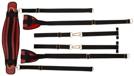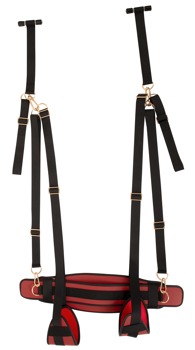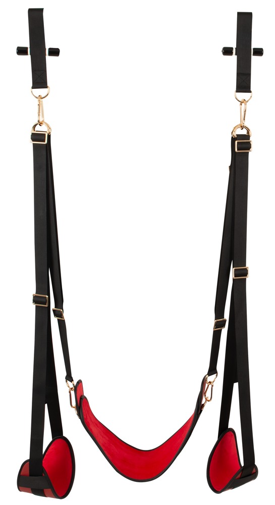 Oplev nye øjeblikke af nydelse med denne stilfulde Door Swing! Det elegante design med sorte stropper, røde komfortpolstringer af fint imiteret læder og guldfarvede accessories gør denne dørgynge til et rigtigt highlight i dit soveværelse. Klar til brug på få sekunder: Du hænger blot gyngen over den åbne dør, lukker den, og de robuste stopper sikrer et sikkert hold – helt uden boring eller værktøj.