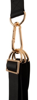 - Stilfuldt design: Sorte stropper, røde polstringer af fint imiteret læder og guldfarvede accessories.