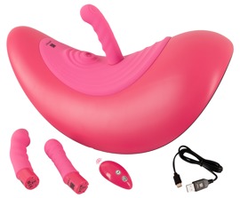 - Genopladelig solosex-vippe med integreret vibepad, 3 udskiftelige stimuleringsaufsatser og fjernbetjening.