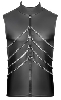 • Snit og materiale: Ærmeløs skjorte i kropsnært snit med ståkrave. Sort mat look, sølvfarvede accessories. For og bag påsatte kant med fængselsringe til 4 medfølgende karabinhager. Kort trykknapstrop i nakken til åbning. 90 % polyester, 10 % elastan, polyuretanbelægning.
