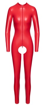 - Snit og materiale: Skridtløs jumpsuit i rød powerwetlook. Kurvebetonende stil med lille ståkrave, lange ærmer og ben. Lang lynlås foran. Helt åben i skridtet. 76% polyester, 24% elastan, polymerbelægning.