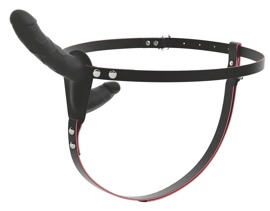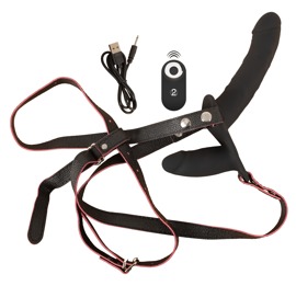 - Double Strap-on – Strap-on-streng i stilfuldt imiteret læder med aftagelig dobbelt naturvibrator (genopladelig) og fjernbetjening (inkl. batteri).