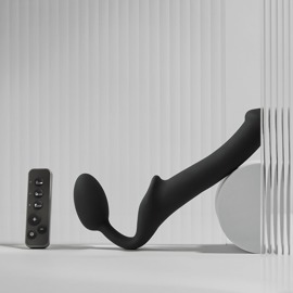 - Triple-vibrator som bælteløs strap-on med fjernbetjening, begge dele genopladelige.