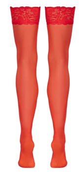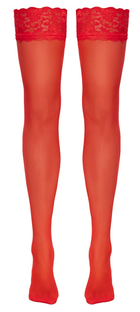 - Snit og materiale: Røde strømper til strømpeholder med elastisk, 9 cm bred blonderkant. Kan fastgøres med clips. Garnstørrelse 20 den. Oeko-Tex-certificeret. 80% polyamid, 20% elastan.