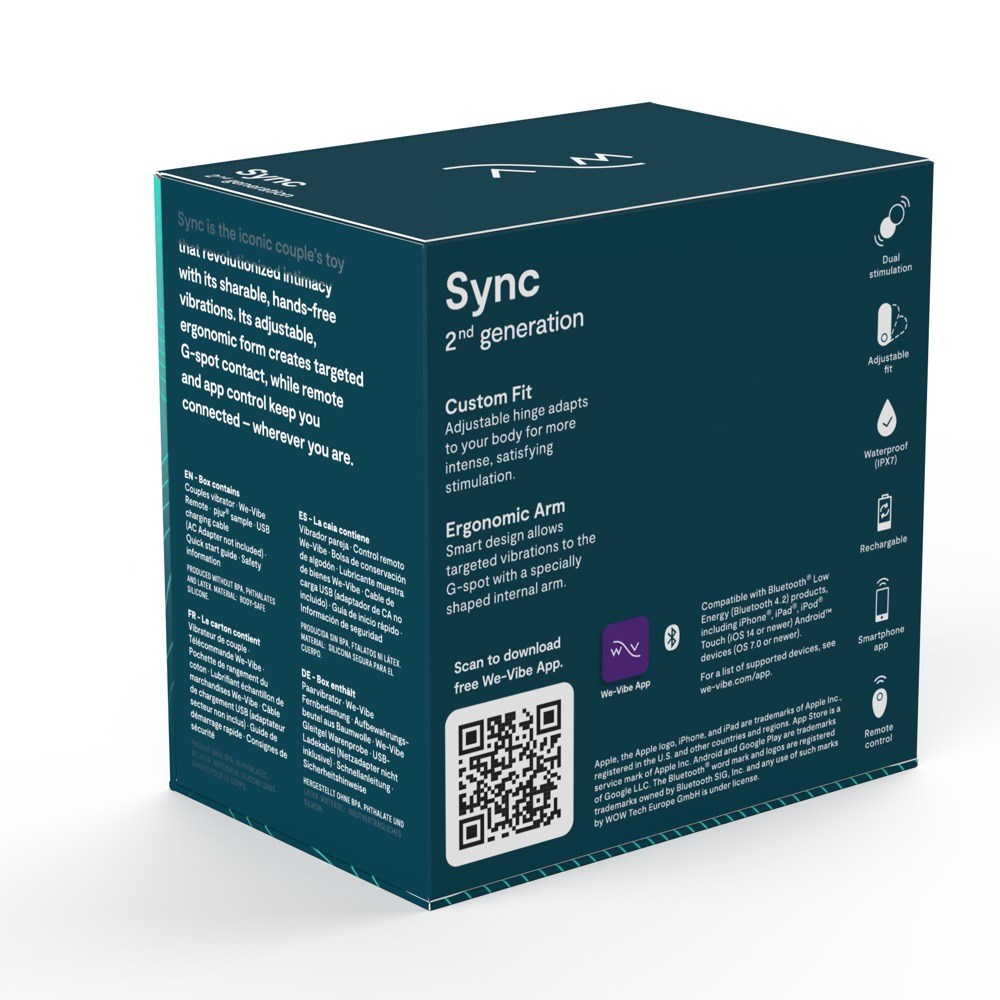 Fjernbetjeningen er også blevet opdateret, hvilket gør den endnu nemmere og mere praktisk at styre. Sync2 er naturligvis kompatibel med We-Vibe-appen til IOS og Android via Bluetooth. Her kan du oprette dine egne individuelle stimuleringsprogrammer og styre vibrationerne bekvemt via din smartphone. Vibrationer i takt med musikken er også muligt. We-Vibe-appen muliggør også seksuel nærhed på afstand. Yderligere stemme-, chat- og videofunktioner er også integreret i appen. Det er muligt at have det sjovt overalt, da Sync 2 er vandtæt.