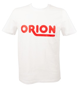 - Hvid T-shirt med rødt ORION-logo-tryk